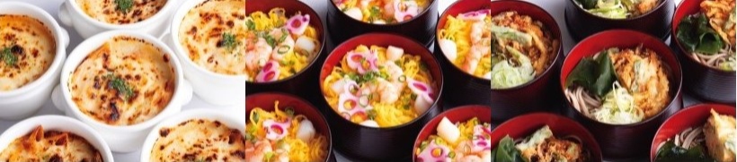 ❶ミートペンネグラタン ❷海老小柱のちらし寿司 ❸かき揚げ蕎麦