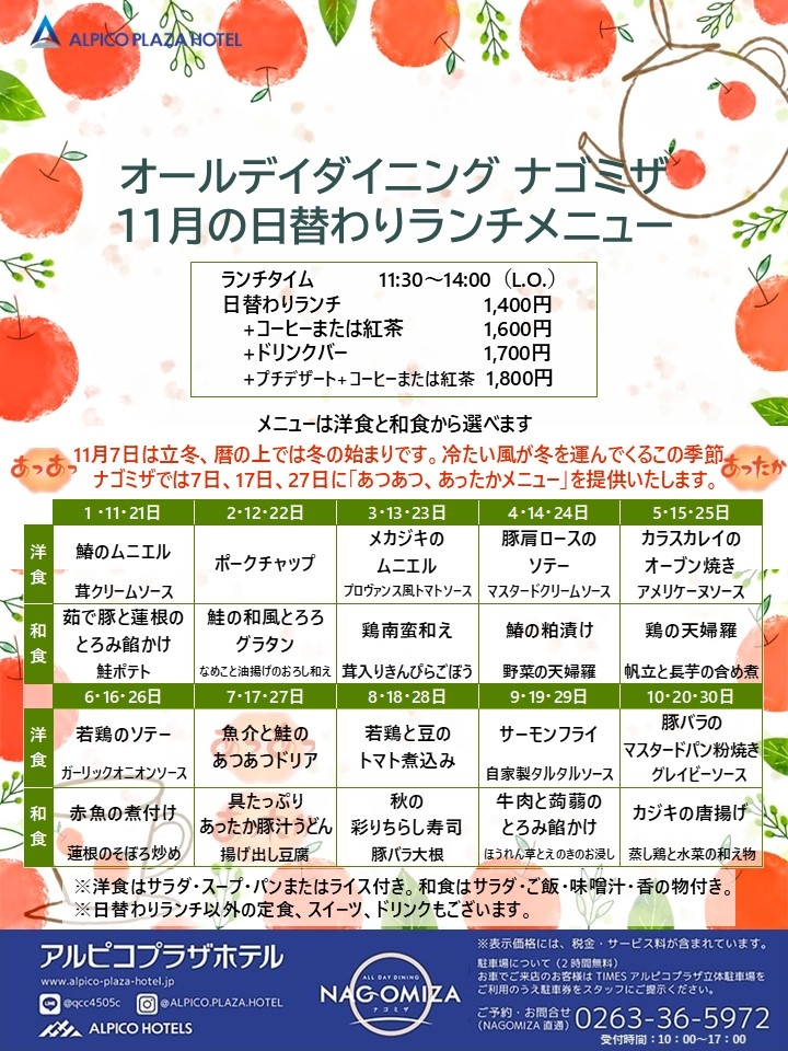 レストラン オールデイダイニング 【ナゴミザ】の11月の日替わりランチメニューをお届けいたします。