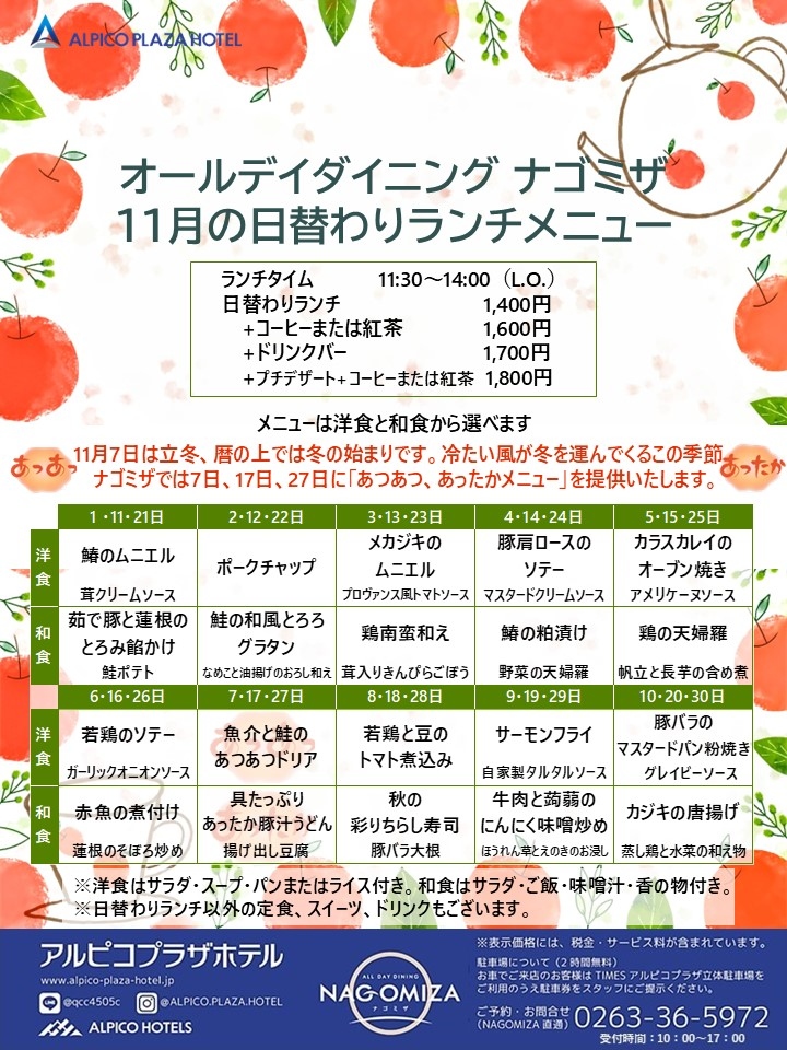 レストラン オールデイダイニング 【ナゴミザ】の11月の日替わりランチメニューをお届けいたします。