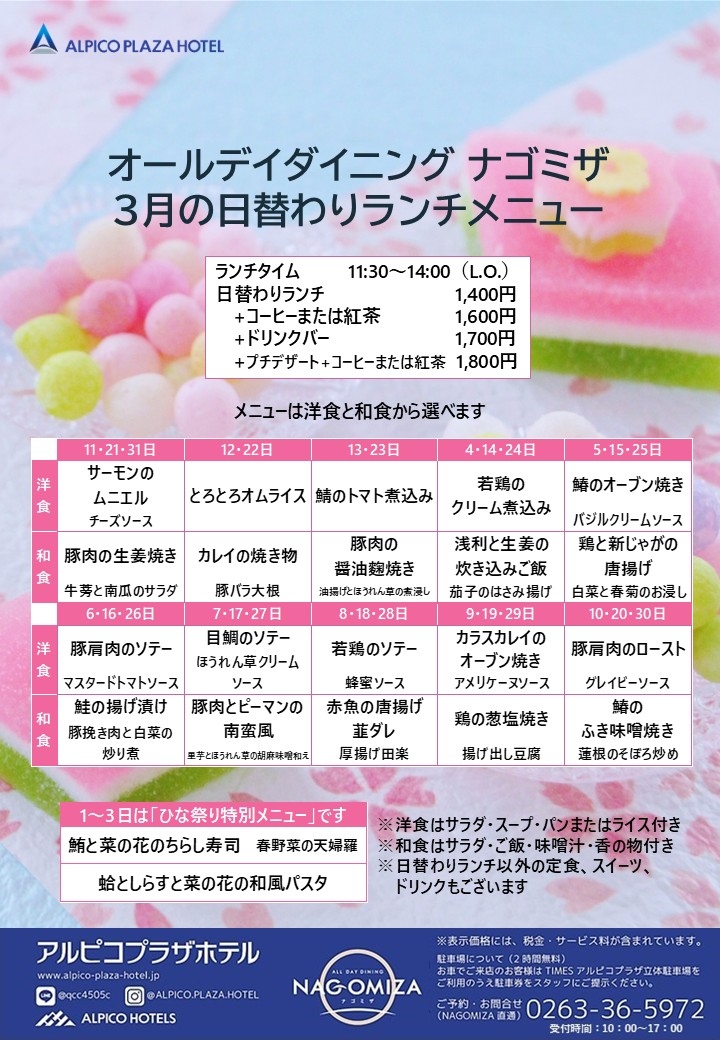 レストラン オールデイダイニング 【ナゴミザ】の3月の日替わりランチメニューをお届けいたします。
