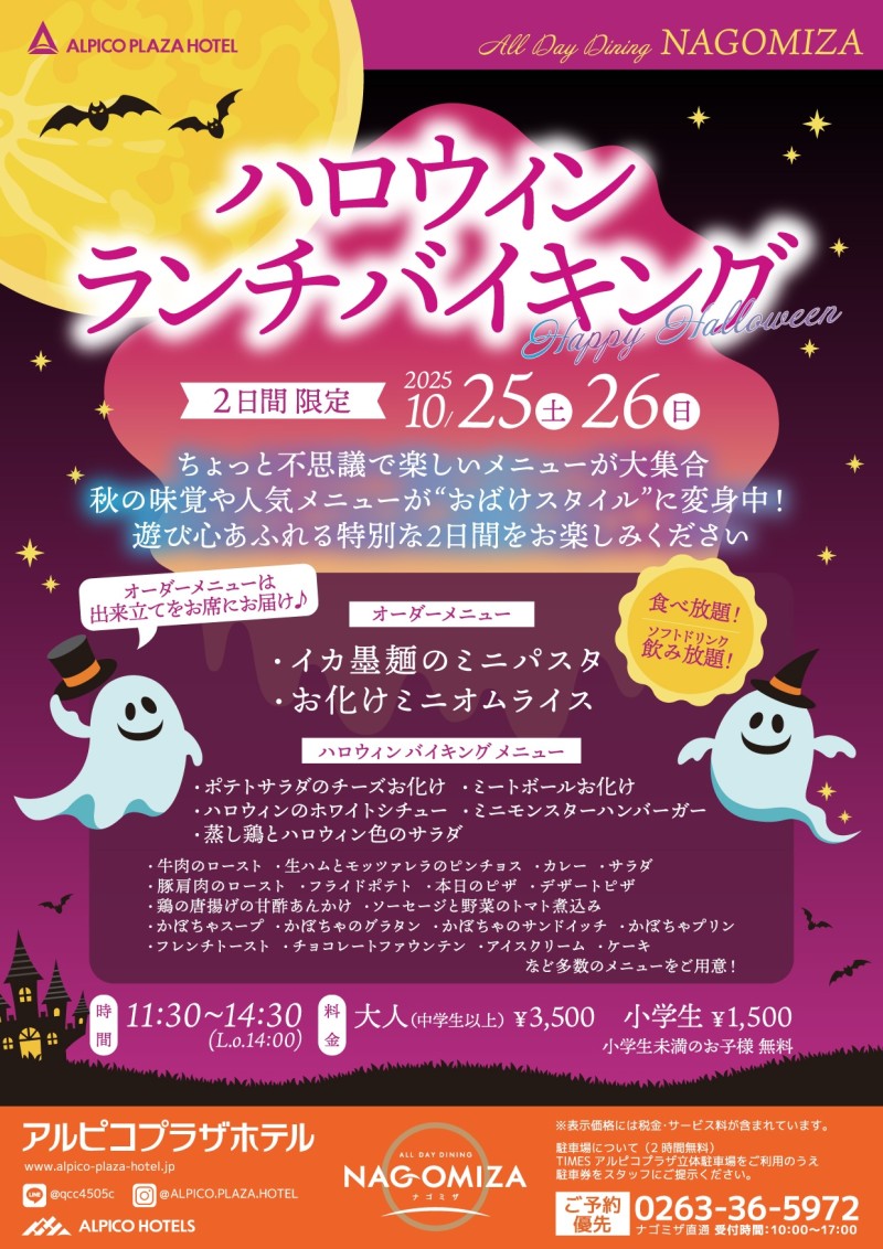 アルピコプラザホテル1階のレストラン『ナゴミザ』では「ハロウィンランチバイキング」を開催いたします! 秋の味覚がハロウィンテイストに変身🎃👻 お子様はもちろん、大人も楽しめる遊び心あふれるメニューがたくさん♪ スイーツコーナーにはチョコレートファウンテンも登場します。 ホテルのレストランでご家族やご友人と楽しいひとときをお過ごしください。 皆様のお越しをお待ちしております!