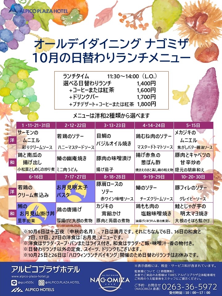 レストラン オールデイダイニング 【ナゴミザ】の10月の日替わりランチメニューをお届けいたします。 洋和2種類から選べるお得なランチセットです。 10月6日は十五夜(中秋の名月)、7日は満月です。それにちなんで6日、16日の和食と 7日、17日、27日の洋食は「お月見」メニューです。是非ご賞味ください。 暑かった夏が終わり、いよいよ秋本番。食欲の秋、スポーツの秋、読書の秋、芸術の秋など、様々な楽しみ方のある季節です。 ご家族やご友人とご一緒に、また、お仕事の昼休みにも、是非ナゴミザへお出かけください。 事前にお席のご予約も承っております。お気軽にお電話ください。 なお、10月25日と26日は「ハロウィンランチバイキング」開催のため日替わりランチはお休みです。 「ハロウィンランチバイキング」もご予約受付中です。 皆様のお越しをお待ちしております。