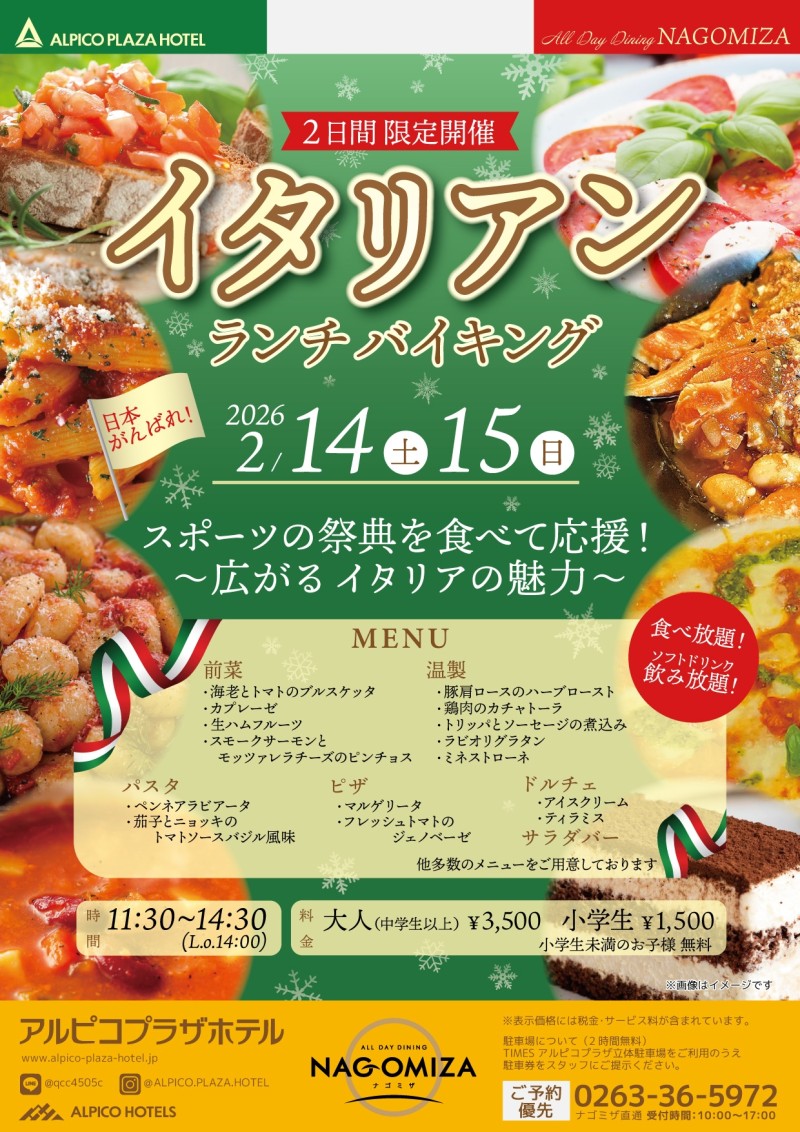 アルピコプラザホテル1階のレストラン『ナゴミザ』では「イタリアンランチバイキング」を開催いたします。 2月に冬のスポーツの祭典が行われるイタリアの料理は、「世界三大料理」の一つとされ、その多様性と美味しさで世界中で愛されています。 日本でもお馴染みのイタリア料理の数々を、ナゴミザのシェフが腕によりをかけて提供いたします。 イタリアで華麗な技やスピードを競う選手の皆さんに思いを馳せながら、ナゴミザで美味しい料理をご堪能ください。 皆様のお越しをお待ちしております。
