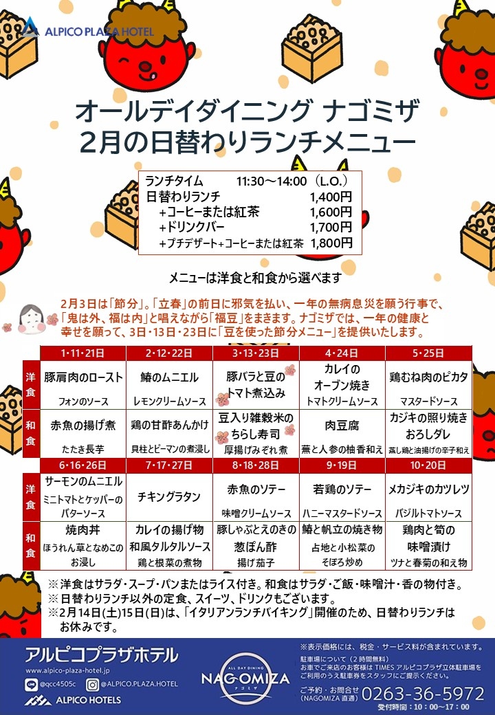 レストラン オールデイダイニング 【ナゴミザ】の2月の日替わりランチメニューをお届けいたします。 洋食と和食から選べるお得なランチセットです。 2月3日は「節分」。「立春」の前日に邪気を払い、一年の無病息災を願う行事で、「鬼は外、福は内」と唱えながら「福豆」をまきます。 ナゴミザでは、「節分」に合わせて3のつく日に「豆を使った節分メニュー」を提供いたします。 おうちで豆まきをする方もしない方も、是非ご賞味いただき、今年一年健康に過ごしましょう。 寒さが厳しい季節ですが、ナゴミザは温かい料理とおもてなしで皆様のお越しをお待ちしております。 事前にお席のご予約も承っております。お気軽にお電話ください。 皆様のお越しをお待ちしております。 なお、2月14日(土)15日(日)は「イタリアンランチバイキング」開催のため、日替わりランチはお休みです。 「イタリアンランチバイキング」もご予約好評受付中です。 席に限りがありますので、お早めにご予約ください。