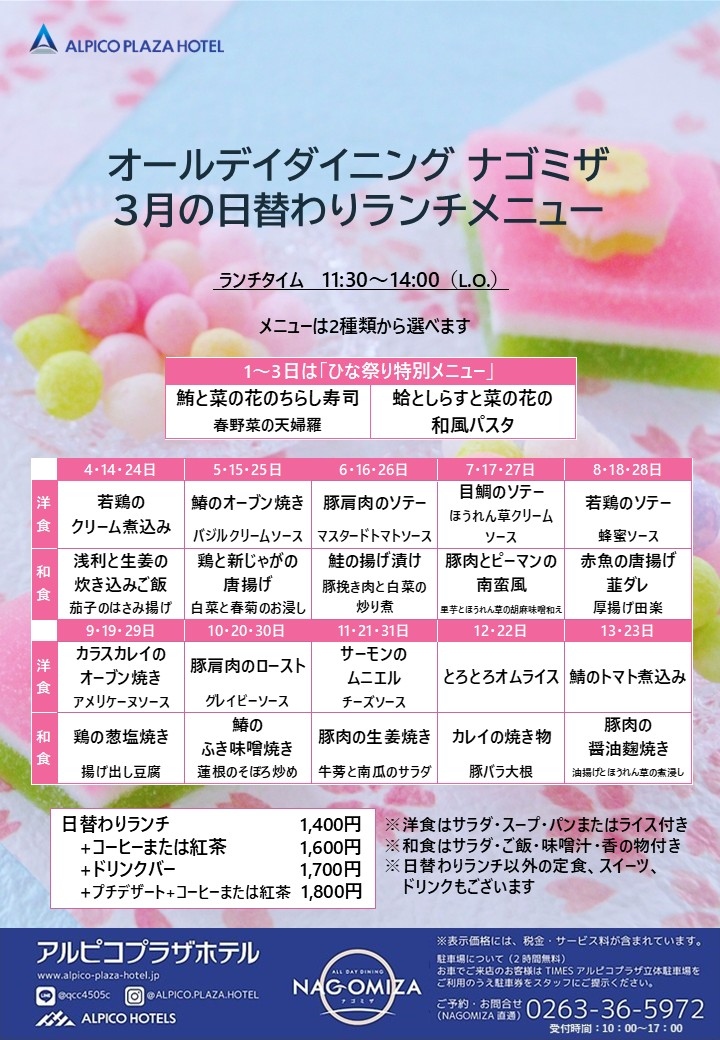レストラン オールデイダイニング 【ナゴミザ】の3月の日替わりランチメニューをお届けいたします。 洋食と和食から選べるお得なランチセットです。 3月1日~3日の日替わりランチは「ひな祭り特別メニュー」です。是非ご賞味ください。 春は3段階で訪れるといいます。①日照時間が少しずつ長くなり日差しに温もりを感じるようになる「光の春」②鳥のさえずりが活発になり、雪や氷が解けて川のせせらぎの音が大きくなる「音の春」③朝晩の冷え込みが徐々に和らぎ、昼間の気温も上がって本格的な春の訪れを感じる「気温の春」 寒かった冬が終わり、本格的に春が訪れる3月、ご家族、ご友人、会社のお仲間とお誘いあわせのうえナゴミザにお越しください。 事前にお席のご予約も承っております。お気軽にお電話ください。 皆様のお越しをお待ちしております。